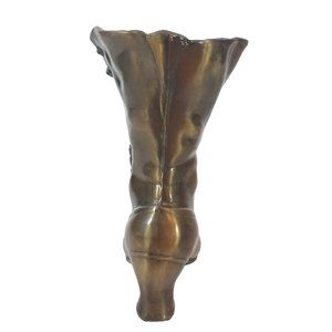 The solid brass Victorian high heel button shoe vase is a beautifully crafted decorative item. Measuring approximately 10" tall x 8" long and weighing around 3 pounds, it is a substantial piece with intricate detailing and a charming patina.