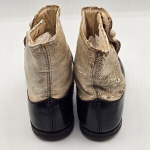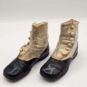 These Victorian-era antique child shoes carry the charm of a bygone era. Crafted from black and white leather, their high-top button-up design speaks of elegance and craftsmanship from the 1890s Edwardian fashion. Whether displayed as a collector’s piece, used for historical reenactments, or cherished as a family heirloom, these shoes tell a story of timeless style. A rare find for antique lovers, these shoes embody the delicate beauty of childhood from over a century ago.