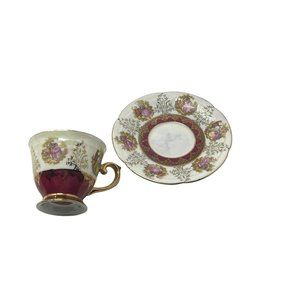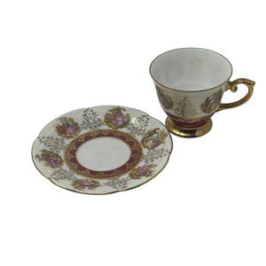 This Kunsthandwerk-Bijouterie demitasse tea cup and saucer boasts a vintage Victorian courting couple design in burgundy, white, pink, and gold with an opalescent finish. Crafted from high-quality porcelain or china, it adds an elegant touch to any tea-serving occasion.