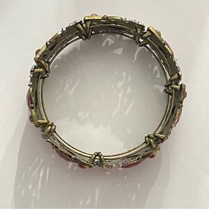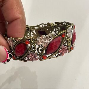 This beautiful vintage bracelet is adorned with red crystals and pink flowers…simply stunning. Perfect for all occasions! One size fits most. Opens and cuffs on wrist. No stamp so brand is unknown.
