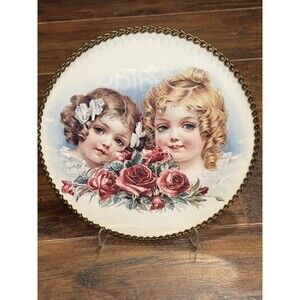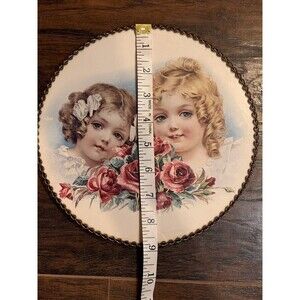Vintage Victorian Girls w/Roses Flue Cover Round Picture w/Chain Edging Detail Wall Hanging, 9", Pre-Owned, Good Condition, No Flaws