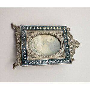 This charming vintage portrait brooch is designed in the style of an ornate miniature picture frame. The oval portrait of a Victorian-era lady is surrounded by an intricately detailed silver-tone metal frame with delicate blue enamel accents.