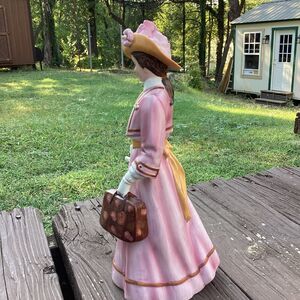 Keywords: Victorian figurine, lady statue, ceramic woman, vintage decor, collectible figurine, roses, flowers, dog statue, pink dress, hat, vintage handbag, table decor, display piece, home decor