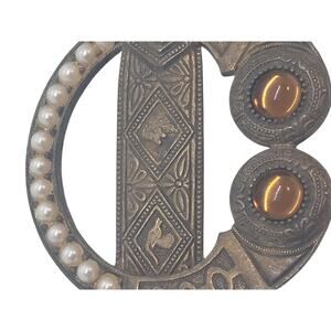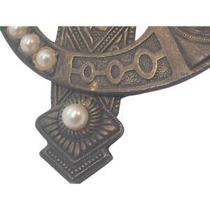 Vintage Victorian Revival Brass Brooch Faux Pearl Amber Glass Cabochons Celtic