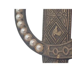 Accented with a row of white faux pearls along the upper arc and two round amber-colored glass cabochons at the bottom.