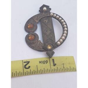 Vintage Victorian revival costume jewelry brooch in a circular Celtic-inspired design with ornate engraved detailing.
