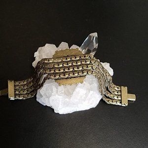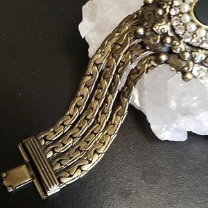 Fabulous Victorian Revival bracelet with a central medallion. The medallion is layered with ornate brass in a leaf and berry design. The center stone is black glass surrounded with a row of faux pearls then a row of sparkling rhinestones. The wide band features 4 rows of ornate flat chain with a secure box clasp. The bracelet is in wonderful condition, unsigned and measures 7 1/2 by 1 5/8".