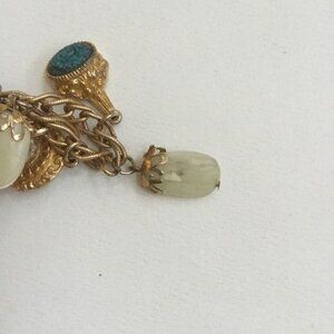 Item shows wear that is consistent with age and use. Some gold loss. A few dark marks on one of the white dangles. Missing the middle charm, but charms can be arranged to be spaced more evenly.