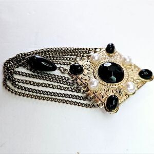This exquisite Vintage brooch features black cabochons with matching faux pearls in a geometric gold tone setting. It is finished with a large dangling black bead and strings of elegant draped chains that add movement and flair to an already eye catching piece. This vintage gem is a true statement piece that embodies the opulence and intricate designs of Victorian revival jewelry combined with the art deco style of the 1980s. Crafted in the 1980s, this piece draws inspiration from Victorian aesthetics, making it a timeless addition to any jewelry collection. It is unsigned. Measures approximately 3.5" long.