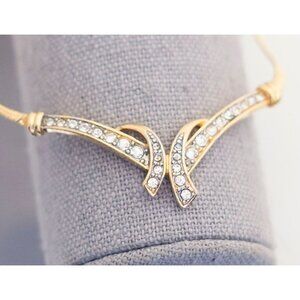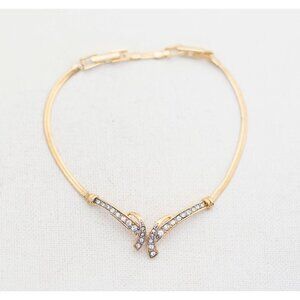 A gold tone bracelet with v shaped design filled with rhinestones.