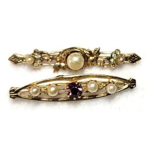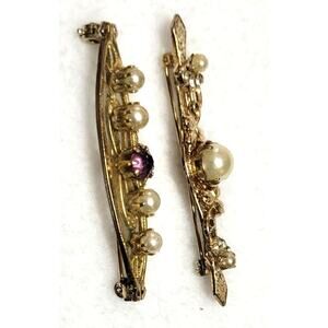 Vintage Victorian Style Bar Brooch Pin 2 Pc Lot Faux Pearls Purple Rhinestone