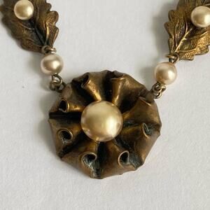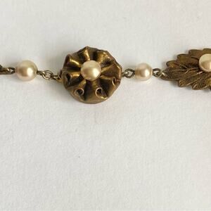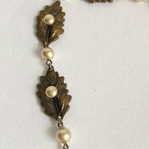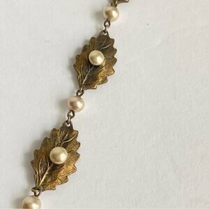 Vintage Victorian Style Faux Pearl Necklace Crimped Leaf Antique Gold Choker