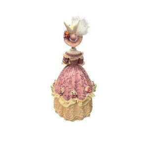 This whimsical bunny figurine exudes old-world charm with intricate floral details and a refined Victorian dress. A delightful addition to elegant home decor.