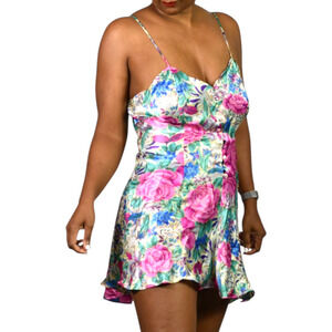 Crafted from a luxurious, silky soft polyester satin fabric, this babydoll style chemise features a vibrant and romantic print. Large pink roses, blue blooms, and lush green foliage adorn the entire garment. Sweetheart neckline. Adjustable spaghetti straps. Partial button front. Flared babydoll silhouette. Gold label.