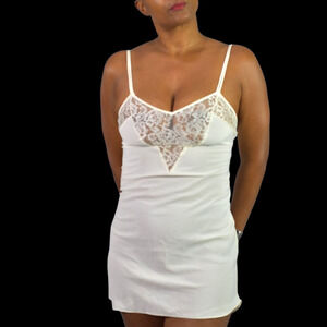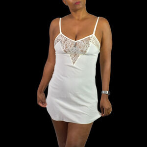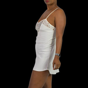 Vintage Victoria's Secret chemise slip nightgown FEATURES stunning, sheer floral lace detail across the bust in a flattering V-shape. Thin, non adjustable spaghetti straps. Curved hemline. Short length. Silky rayon blend.
