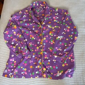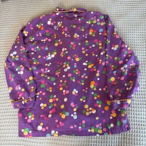 Victoria's Secret women’s flannel pajama set. Marked size medium; please refer to measurements provided to compare with modern sizing. Purple with polka dot motif. Button down top with chest pocket and Victoria's Secret heart logo. Bottoms have elastic waist with drawstring. Show some wash wear and there is one spot on the left sleeve - see photo. Judging from the tags these pajamas are probably from the 2000s.