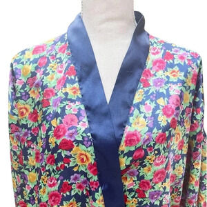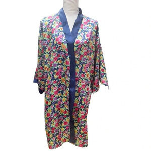 Bright, romantic and so soft—this vintage Victoria’s Secret robe features an allover multicolor floral print on a deep navy ground with a sleek navy satin shawl collar. Wrap silhouette with internal ties and an exterior waist tie for an adjustable fit. Lightweight satin-finish polyester drapes beautifully.
