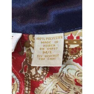 This Victoria's Secret robe offers a sophisticated design with a luxurious silk fabric, featuring a paisley and floral print. The navy blue trim adds a touch of elegance, while the belted waist ensures a comfortable fit. Ideal for lounging in style, this robe provides both comfort and a refined aesthetic.