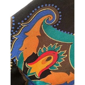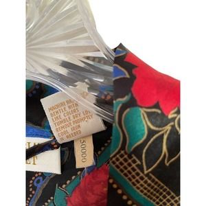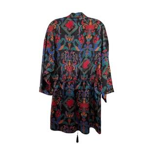 Vintage Victoria's Secret gold label short kimono robe in black with jewel tone graphic print. Lux satin material with a gorgeous striking floral and baroque style print. 3/4 dolman sleeves. Elastic waist and tie closure. 1 of the ties is missing the tassel on the end. Small black dot on the print on 1 sleeve. In good vintage condition.