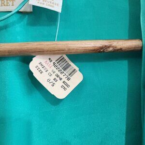 Gorgeous vintage Victoria’s Secret Gold Label satin robe in a stunning teal color. This long, kimono-style robe drapes beautifully with wide sleeves and side slits, creating an elegant, flowing silhouette. Originally came with a belt (missing), but can be worn open for a chic lounge look or styled with your own belt for a cinched fit. Rare vintage find