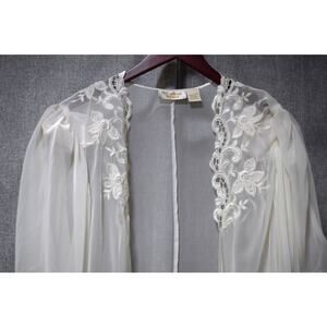 Elegant vintage Victoria’s Secret sheer robe in soft ivory. Features delicate floral embroidery with pearl-like bead accents along the shoulders and neckline, and flowing sheer draped sleeves. Made in the Philippines from lightweight polyester with a timeless romantic silhouette. Perfect for layering over sleepwear or as a collectible piece from the early Victoria’s Secret lingerie line.