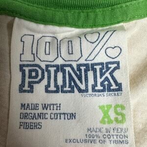 This Victoria's Secret long sleeve tee combines a sporty design with a classic crew neckline and vibrant green raglan sleeves. The white body is adorned with bold navy blue text graphics, making it a standout piece for casual wear. Perfect for adding a pop of color to your everyday look.