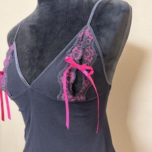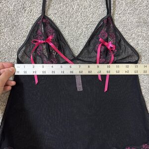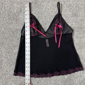 Item: Womens lingerie cami style shirt in a sheer mesh with lace and ribbon details, tagged size Medium.