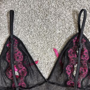 Color: Black mesh with pink floral lace and bright pink satin ribbon self tie bows.