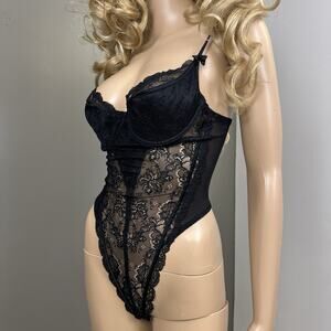 Listed is a vintage Victoria’s Secret sheer lace bodysuit, size 34C, in classic black.