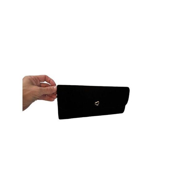 Elegant black velvet clutch with a gold heart accent. Versatile for evenings or special events, fits essentials like phone, keys, and cards.