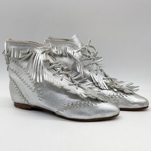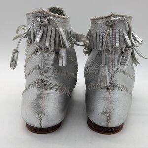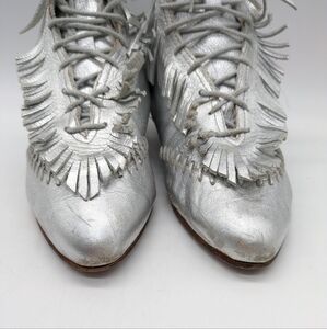 Vintage Video Silver Leather Fringe Lace Up Ankle Boot 5.5. Some discoloration and scuffing, wear on the bottom (see photos)