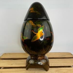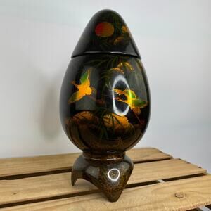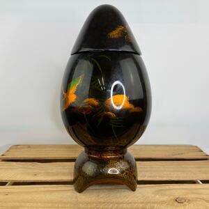 Vintage Vietnamese Egg Deco Trinket Box Black Enamel Crane Bird Gold
