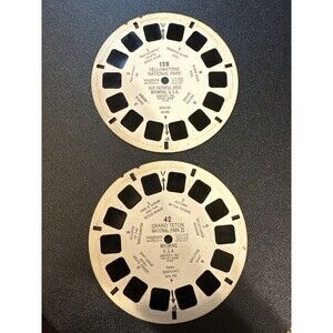Set of 7 original Sawyer’s View-Master reels featuring U.S. National Parks: Yellowstone, Grand Teton, Yosemite, and Great Smoky Mountains. Includes duplicate Old Faithful reel and several original blue sleeves. Classic mid-century Kodachrome color with vivid 3-D images. Light vintage wear and some handwriting on backs, but overall very good for age.