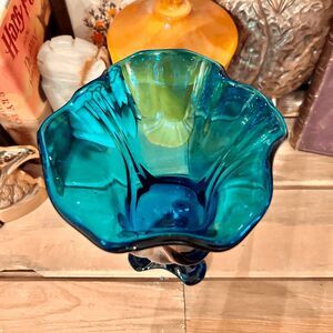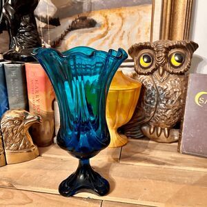 This gorgeous Bluenique glass vase from Viking’s Epic Drape collection is a stunning example of Mid Century craftsmanship. With its vibrant blue color, flared shape, and unique three-toe pedestal base, this vase is a true showpiece.