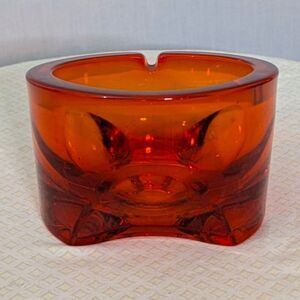 This vintage Viking Glass ashtray is a stunning piece of mid-century modern decor, featuring a unique tripod design in a striking orange persimmon color. Hand-blown in the United States in the 1960s, this art glass ashtray showcases the signature glossy finish and abstract shape characteristic of the MCM style.