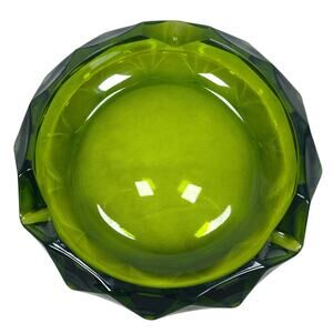 Vintage Viking Glass Cigar Ashtray MCM 8.5" Green Diamond Faceted Diamond Cut