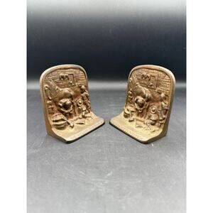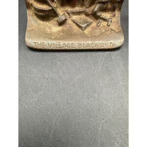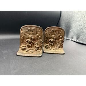 Charming vintage set of 2 cast metal bookends featuring “The Village Blacksmith Shop” design. Each bookend is embossed with a detailed scene of a horse inside a stable with the blacksmith’s tools in the background. Solid and sturdy with a rustic finish, these bookends add both function and character to any bookshelf or study. A wonderful collectible for equestrian enthusiasts or lovers of antique-style décor. Good vintage condition with natural patina and light wear consistent with age. Great value!!