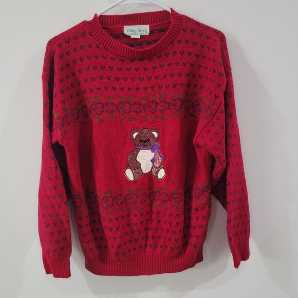 Vintage Village Green Womens Sweater Size Small Birdseye Knit Novelty Teddy Bear