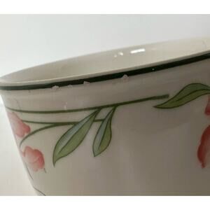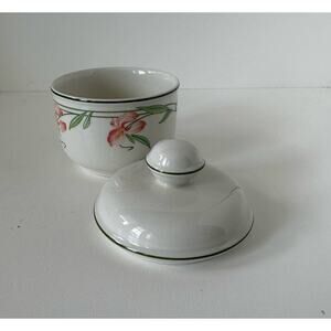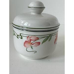 Peach Flowers, and dark wavy stems adorn this late 80's early 90's porcelaine china pattern. Note the 3 tiny flea bites on edge of bowl. Not visible when lid is on, and barely visible when off.