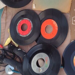 Collection of vintage vinyl records. Features various labels and designs. Perfect for music enthusiasts.