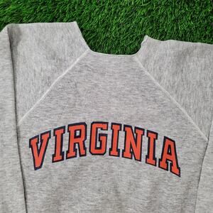 Vintage Virginia raglan sweatshirt in women's medium. Classic gray pullover with bold arch spellout design. Cozy and timeless. Shop now!