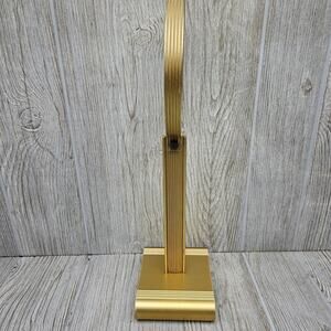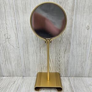 Features a round tilting mirror in a sturdy gold-tone brass stand with Art Deco inspired lines on the base.