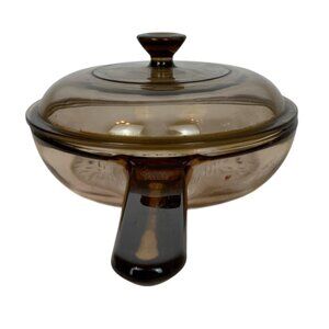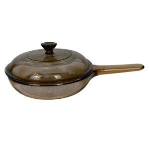 This vintage Vision Corning skillet features a durable amber glass design and includes a matching Pyrex lid. Ideal for stovetop cooking, it is both stylish and functional.
