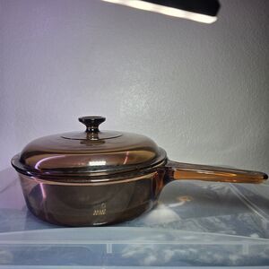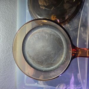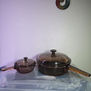 Vintage Visions Cookware Amber Glass Set Of 2Pans Lids Corningware PYREX Vision