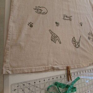 Beige color, featuring cats and clothes...the cats pajamas?....and paw prints.