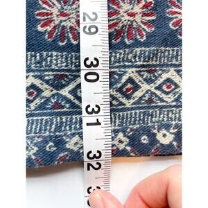 Blue, red, and white patterned 100% cotton pencil skirt with a slit on the back center. Has belt loops. Zips up the back. Made in the USA. Excellent vintage quality and construction! Very soft and not too rigid.