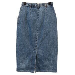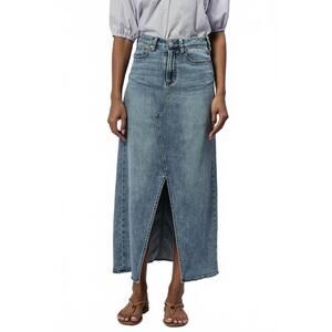 Keywords: denim skirt, maxi length, vintage style, blue jeans, casual wear, midi skirt, back vent, classic fit, everyday, workwear, staple piece, basic