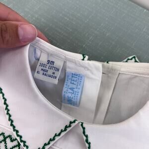 Vintage Karla Lacayo PourVive-La-Fete Hand Smocked Button On Shortall Romper. Baby boy size 9 months. Dead stock, brand new with tag (NWT). Hand smocked two piece special occasion outfit. Short sleeve white collared top with pleats and green smocking across the chest and coordinating fine cord red bloomer shorts. Shorts are fully lined. Buttons in the back of the top and to attach the shirt to the bottoms. Timeless set is perfect for Christmas!