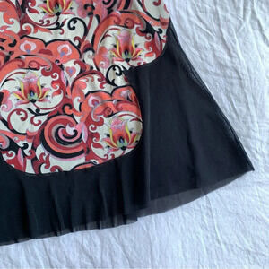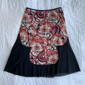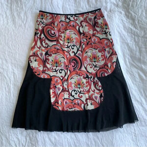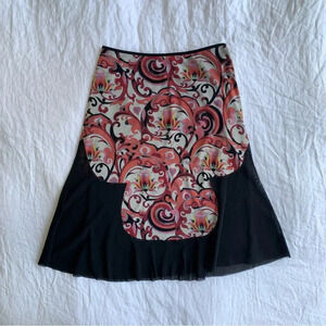 Vintage Vivienne Tam Mesh Black Print Knee Mid Length Skirt 90s Y2K
