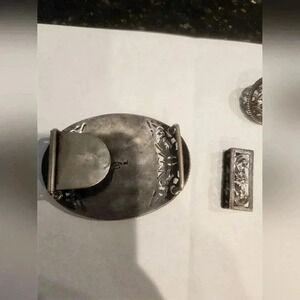 Vintage Vogt open work buckle with matching keeper, tip and matching bridle rosette! Rosette is used for cowboy wild rag! This Vintage set is a delicate beautiful Sterling Silver with 18k gold detail. This is in natural patina, which can be polished to the extent of buyers want or kept with natural patina. I did not remove the buckle tip from the original belt, leaving that to you or your leather worker to do professionally. This was a family piece and has been stored for years. All 4 pieces come together as a set, will not separate.